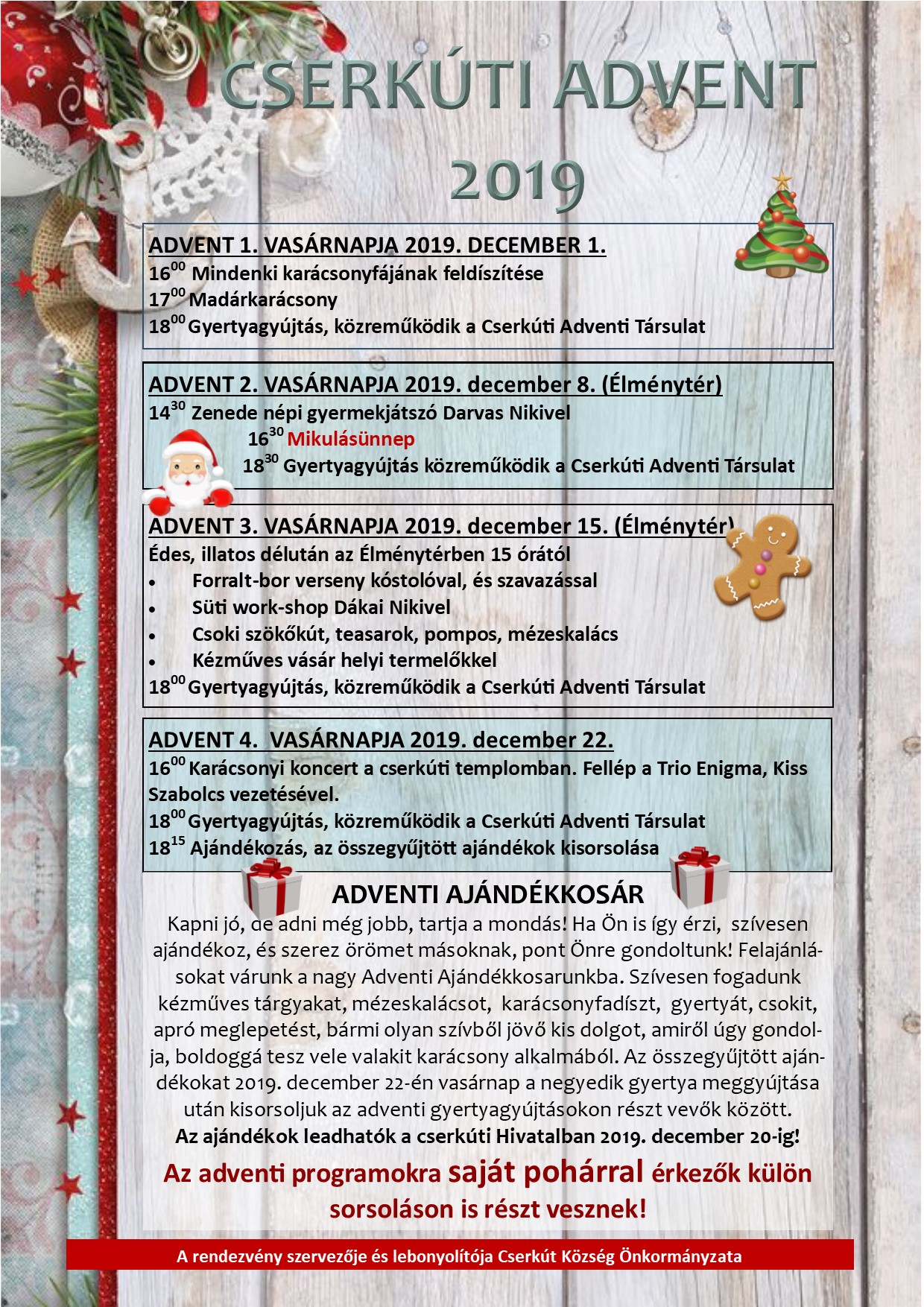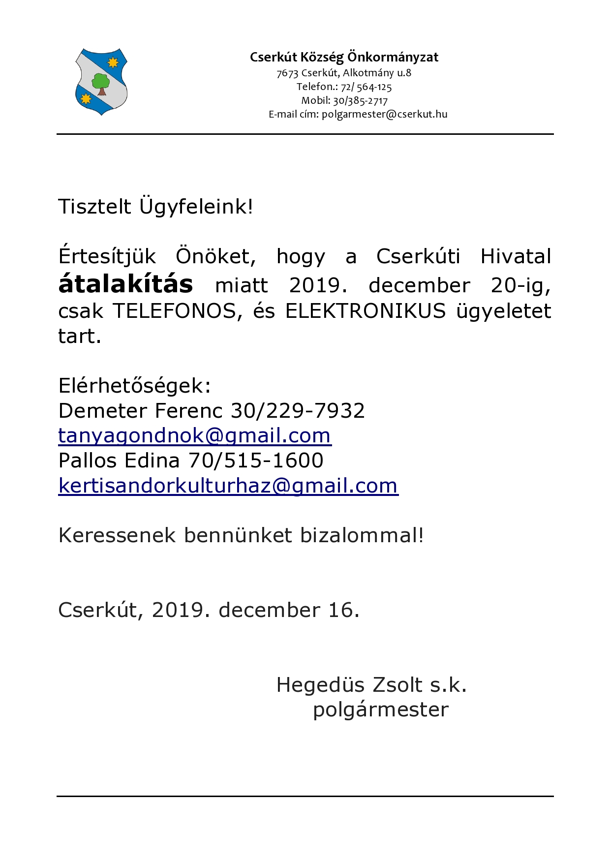 Cserkút Község Önkormányzat Képviselő-testülete 2019. december 09-én, 18.00 órakor testületi ülést tart, melyre ezúton tisztelettel meghívom.