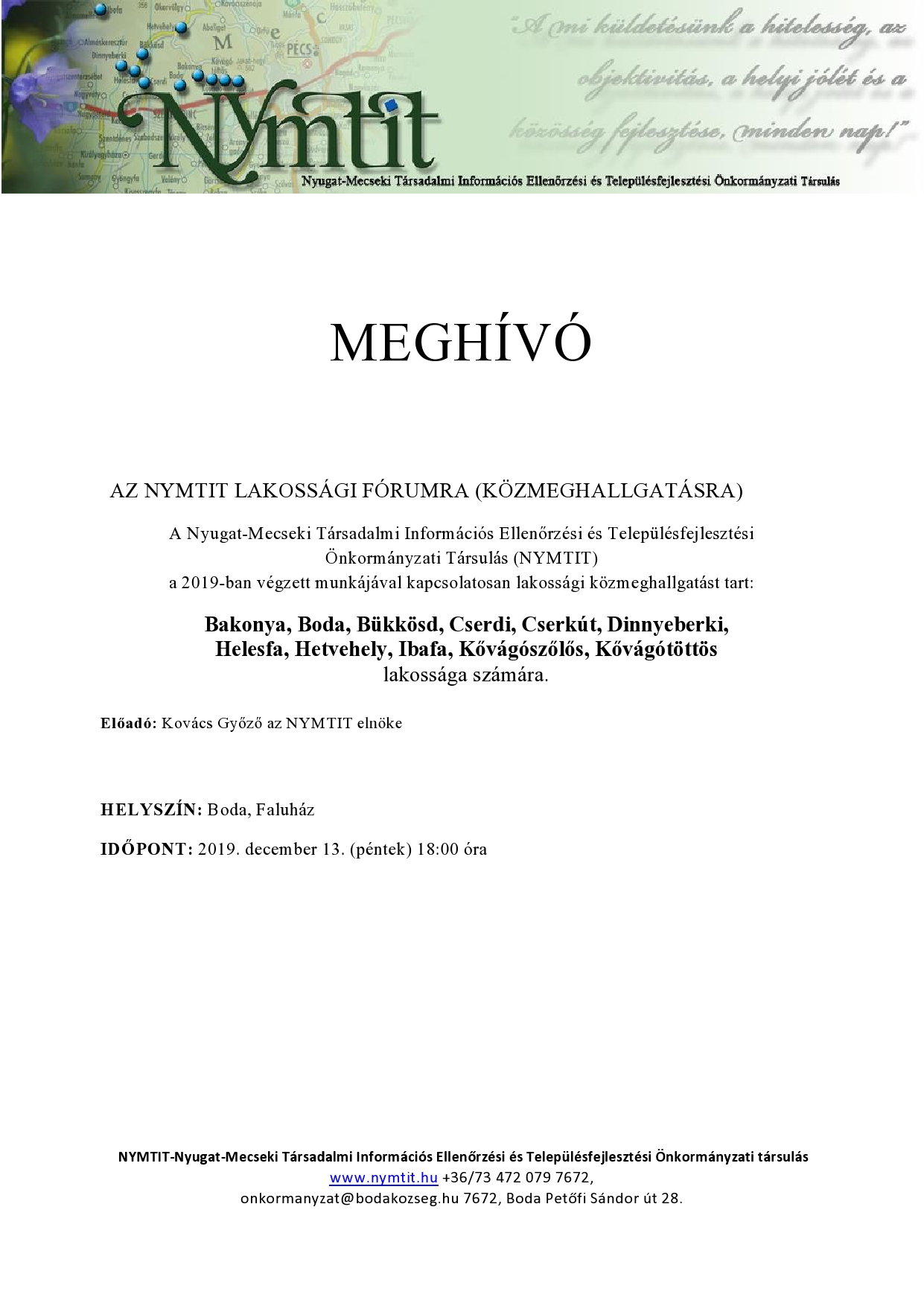 Cserkút Község Önkormányzat Képviselő-testülete tájékoztatja a lakosságot, hogy a 2019. november 27-én, 18:00 órára meghirdetett közmeghallgatás napirendje kiegészül az új önkormányzati ciklusban alakítandó Közös Önkormányzati Hivatal tárgyával.