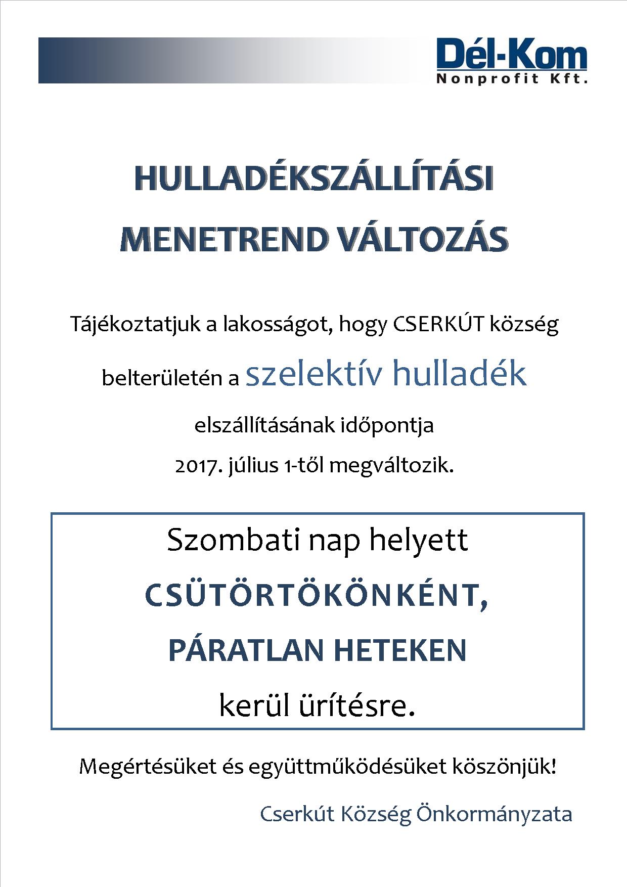 Cserkút Község Önkormányzat Képviselő-testülete 2017. július 3-án, 15 órakor testületi ülést tart, melyre ezúton tisztelettel meghívom.